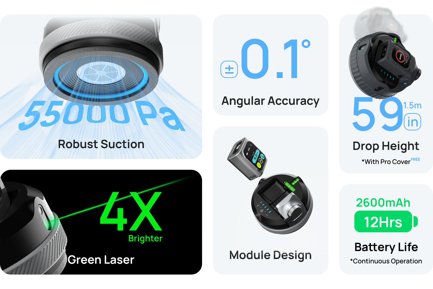 - Seamless Efficiency – Eliminates constant tool switching by integrating laser measurement, leveling, and real-time data recording into one modular system.