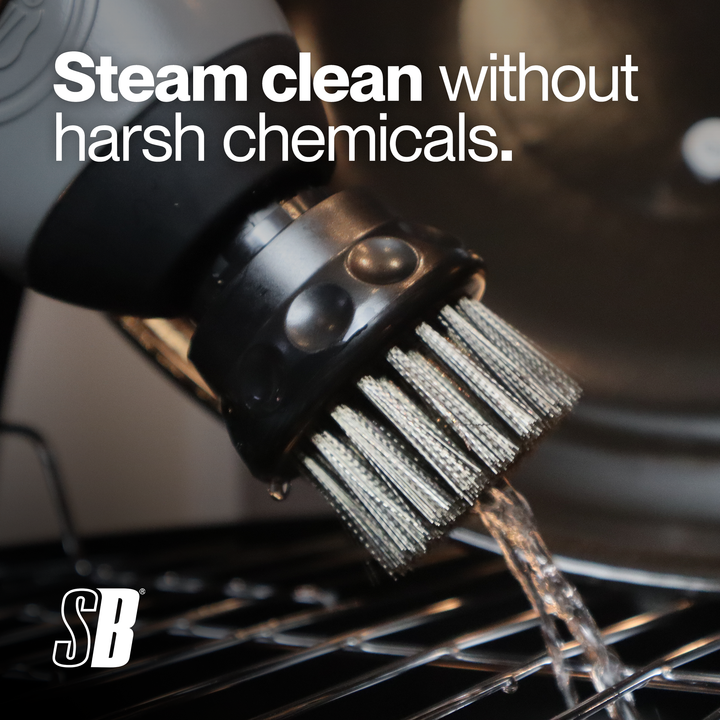 Brush & Steam: As you brush, release water to instantly create steam. Watch the grime dissolve, then use the scraper for any tough spots. It's that simple!